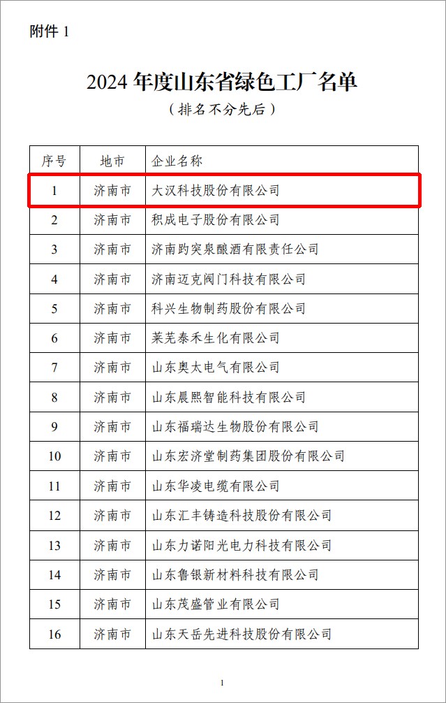 近日,在山東省工業和信息化廳公布的《2024年度山東省綠色制造單位名單的通知》中確定大漢科技股份有限公司等企業為省綠色工廠。